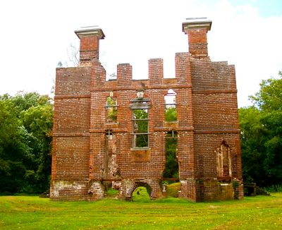 The ruins of Rosewell Plantation display a three-story English Baroque design with Flemish bond brickwork spanning 12,000 square feet near the York River.