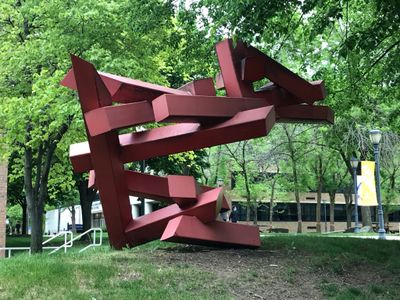 American artist Ernest Carl Shaw created this public art installation in 1978 as part of his exploration of structural forms at Marquette University campus.