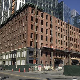 The buildings are located along Atlantic Avenue in a busy and accessible area of Boston with regular pedestrian traffic. Visitors can view the exterior facades at any time from the street and observe the architectural details of these historic structures.
