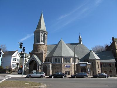 The church building combines architectural elements from both Gothic Revival and Queen Anne styles, constructed with Roxbury pudding stone and decorated with stained glass windows.