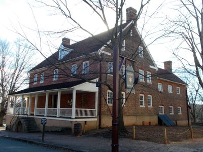 The two-and-a-half-story brick tavern features public rooms on the ground floor and sleeping quarters above, with a kitchen located in the rear section.