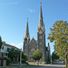 Saint John's Evangelical Lutheran Church features two distinct spires reaching heights of 127 and 197 feet, with cream brick walls and tall Gothic-arched windows.