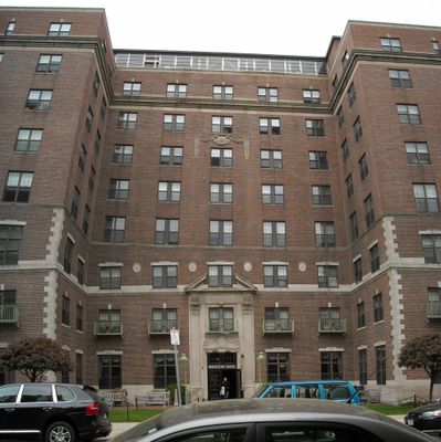 The dormitory maintains its original 1920s hotel elevator system, including mechanical indicators and brass-trimmed entrance doors on each floor.