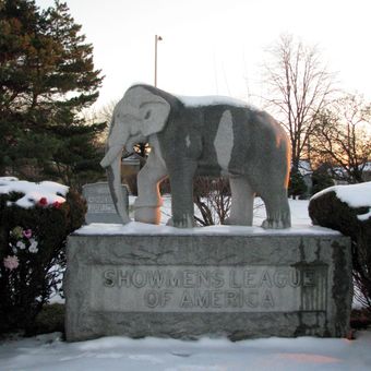 Showmen's Rest is a burial section within Woodlawn Cemetery in Forest Park containing around 750 plots, marked by five stone elephants with their front feet resting on balls. The area serves as a dedicated ground for circus industry members and is maintained by the Showmen's League of America.