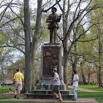 Silent Sam is a work of art in Chapel Hill, United States, showing a Confederate soldier cast in bronze. The figure holds a rifle and looks toward the horizon while standing on a pedestal.
