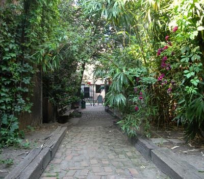 The entrance gate opens daily from dawn to dusk, allowing visitors to rest on wooden benches beneath mature trees in this enclosed space.