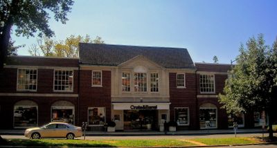 Six connected commercial buildings form the shopping center along Massachusetts Avenue, featuring symmetrical shapes and traditional American architectural details.