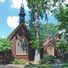 The church features vertical board walls, pointed arches, steeply pitched roofs, and a frame steeple that rises above East River Road.