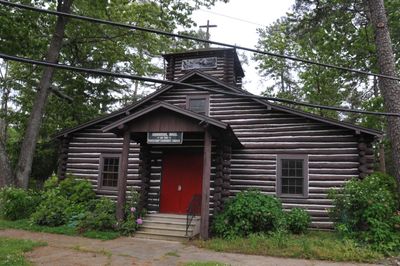 The St. Mary of the Lakes Catholic Church stands at 108 Stokes Road, constructed with logs in a traditional cabin architectural style.