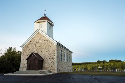 The fieldstone church building stands three miles south of State Route 33 on County Highway Y, featuring traditional mortared stone construction throughout its structure.