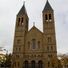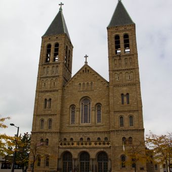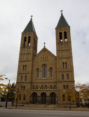 St. Bernard's Church exhibits German Baroque Romanesque architecture with symmetrical stone walls and semi-circular arches rising at 44 University Avenue in Akron.