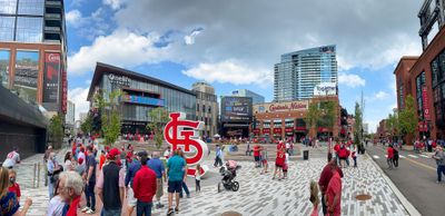 Together Credit Union Plaza features outdoor screens and designated markers showing the exact locations of bases from the former Busch Memorial Stadium.