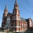 The church features a tall bell tower with a spire, brick exterior walls with stone accents, and large pointed-arch windows filled with stained glass.