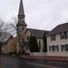 The stone church building stands at the intersection of Main Street and Church Lane, featuring traditional New England ecclesiastical architecture with white trim.