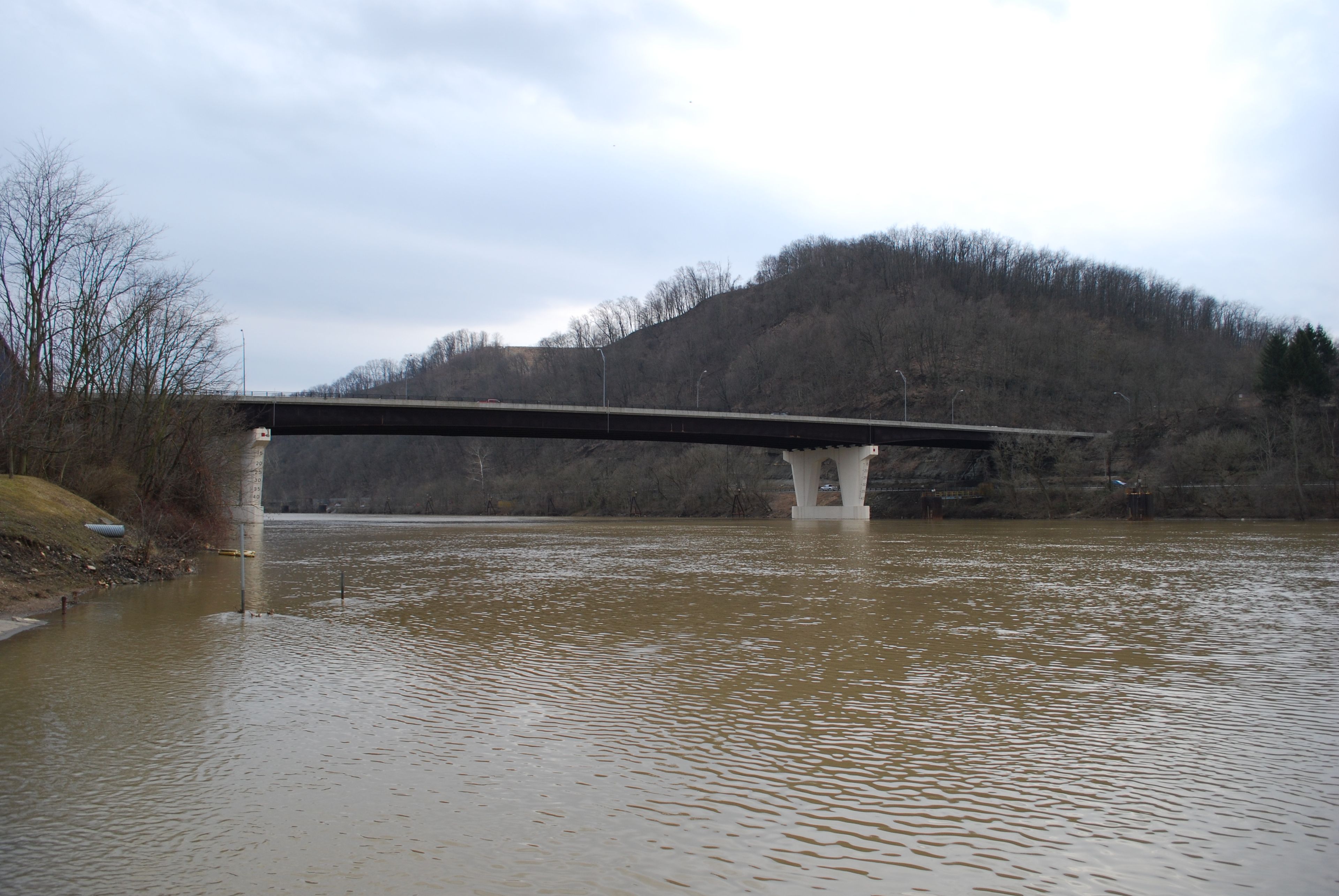 The bridge carries approximately 29,700 vehicles daily across its four through lanes and one turn lane, serving western Monongalia County.