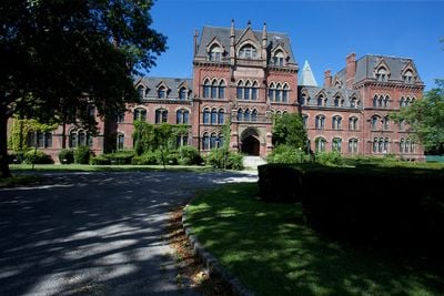 The 500-room brick structure features a prominent clock tower, numerous classrooms, laboratories, libraries, dining halls, and an extensive chapel complex.