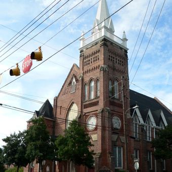 Regular worship services take place in this National Register of Historic Places listed building, which maintains its original structural elements and architectural features.