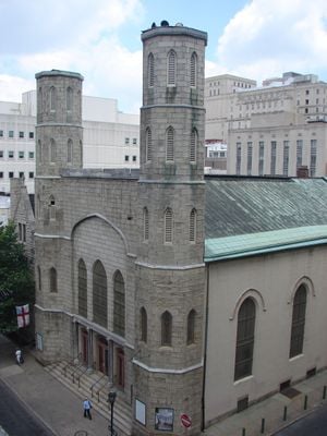 The church maintains regular services every Sunday at 4 PM and Thursday at 12:15 PM, welcoming visitors at the corner of Tenth and Ludlow Streets.