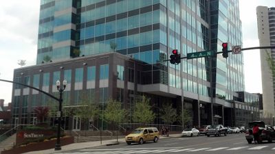 SunTrust Plaza is a commercial building in downtown Nashville with 13 stories and modern architecture that fits into the business district skyline. The building holds office spaces, public areas, and several dining options including Panera Bread.