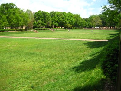 The Sunken Garden spans 2.7 acres of grass terrain set below ground level, stretching from the Wren Building towards Crim Dell pond.