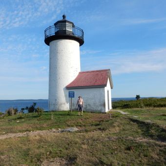 The cylindrical stone tower with a black lantern stands at 8.5 meters tall on Naushon Island, serving as a navigation aid for vessels.