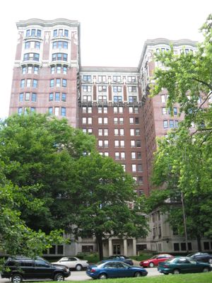 The Aquitania stands fifteen stories tall with 82 cooperative apartments, featuring a courtyard design and Art Moderne lobby near Lake Michigan.