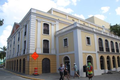Located on Fortaleza Street facing Plaza de Colón, the theater accommodates 640 spectators across three levels with red velour seating.