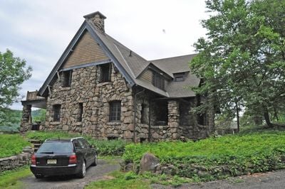 The Boulders features a rectangular stone design with a two-story structure and prominent gable-roofed bay situated near Greenwood Lake in Orange County.