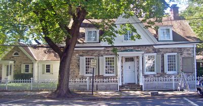 A commemorative plaque installed by the Daughters of the American Revolution in 1897 marks the house's survival during the Revolutionary War period.