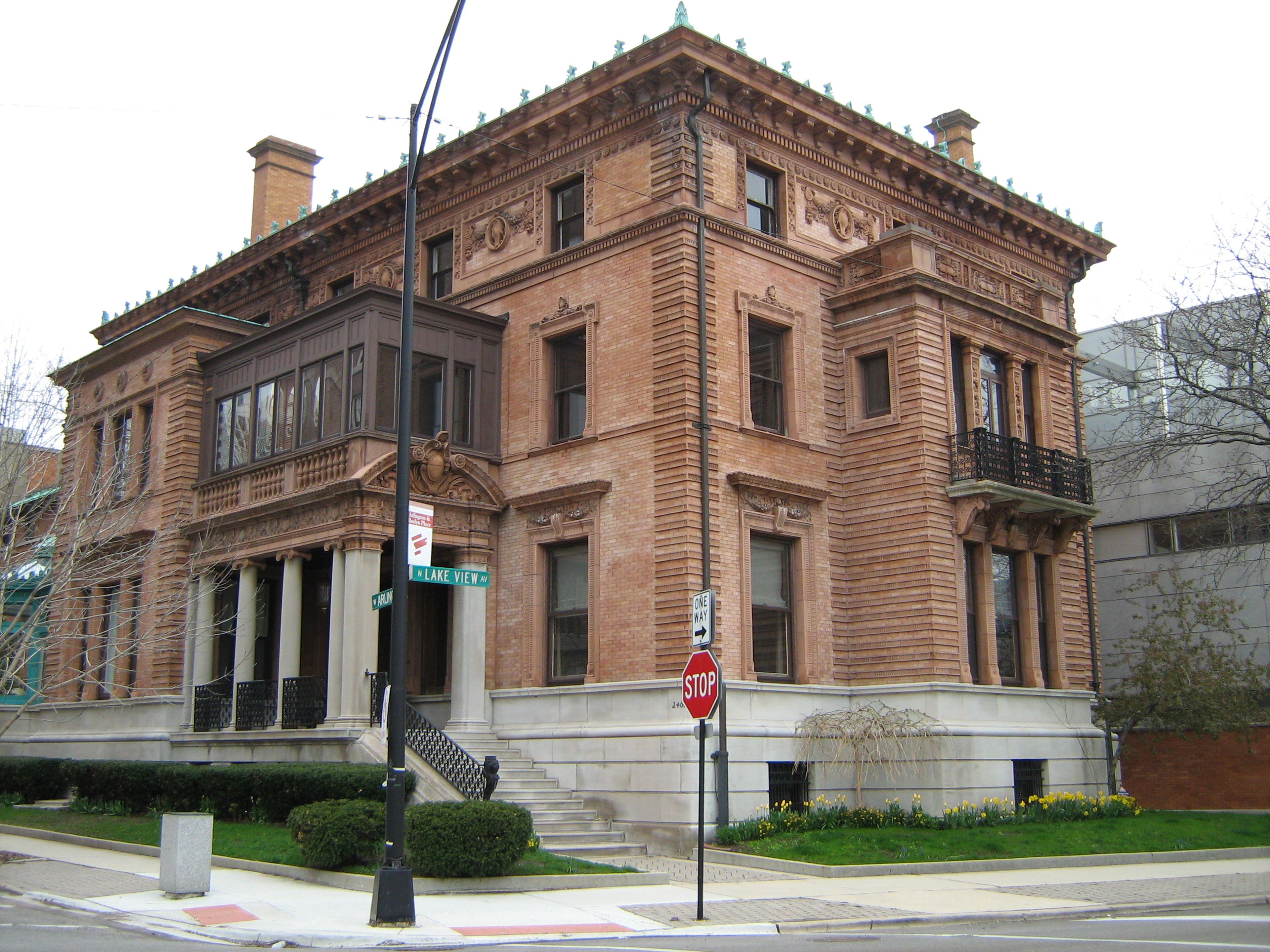 The mansion features a top-floor ballroom with panoramic views of Lincoln Park and Lake Michigan, along with interior elements including mahogany woodwork and stained glass windows attributed to Louis Tiffany.