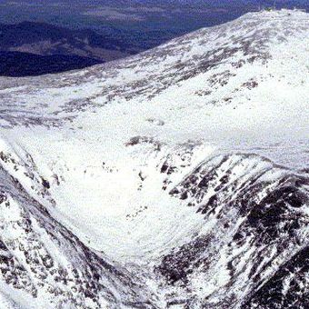 Tuckerman Ravine is a mountain valley on Mount Washington's southeast face with slopes ranging from 40 to 55 degrees. The formation collects natural snowpack that can reach depths of around 100 feet in some winters.