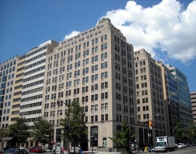 The Tower Building is a 14-story skyscraper constructed in Art Deco style along K Street Northwest. Its facade displays characteristic geometric forms and elaborate decorative elements that define the architecture of that period.