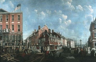 The Tontine Coffee House stood at 82 Wall Street, constructed with red brick in a neoclassical style featuring multiple windows and a sloped roof.