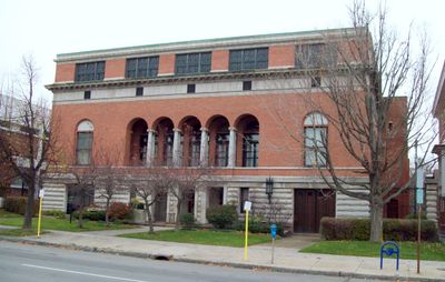The Twentieth Century Club occupies a three-story Italian Renaissance building constructed with Indiana limestone and red pressed brick at 595 Delaware Avenue.