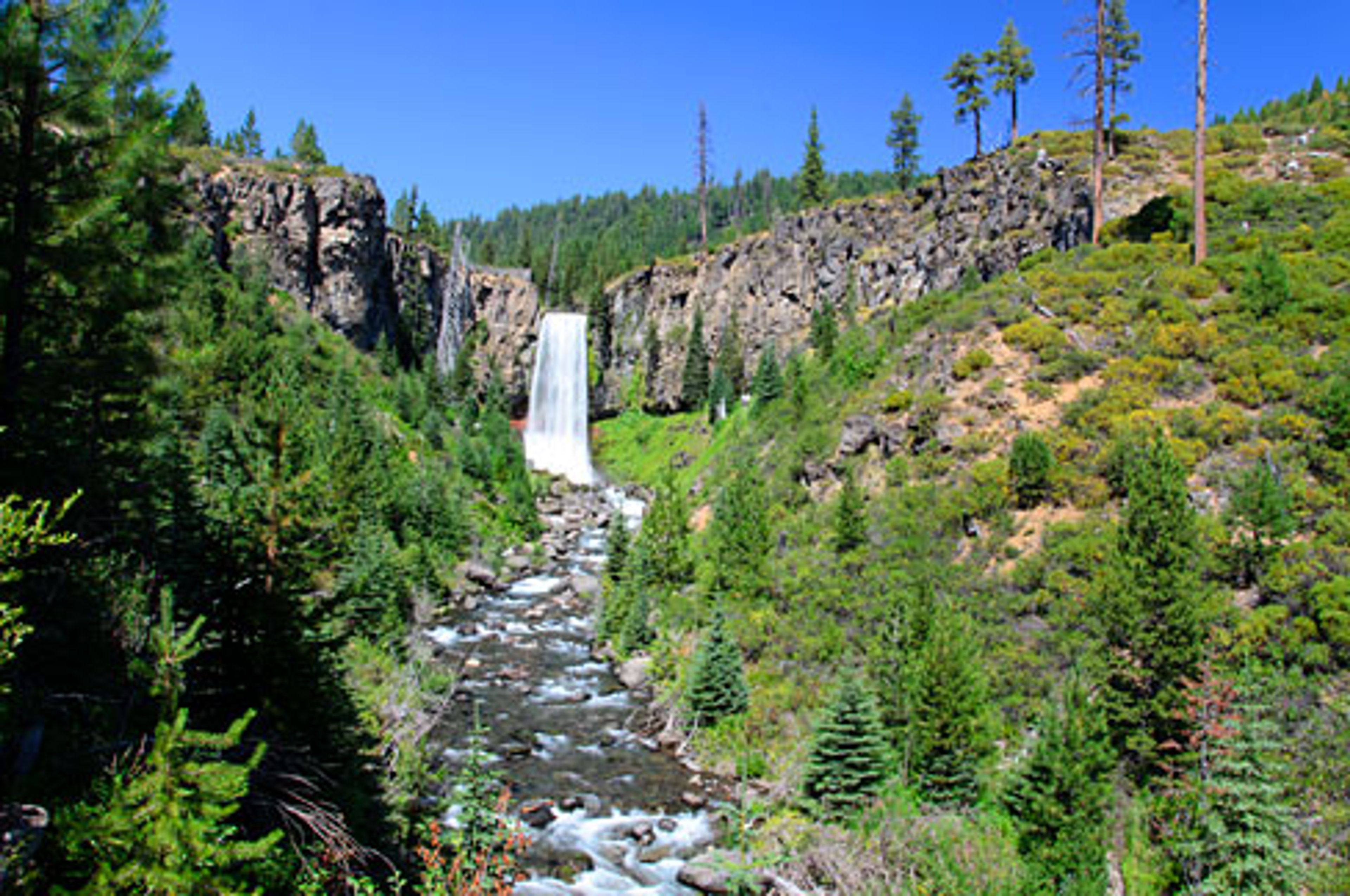 The 97-foot Tumalo Falls descends from Tumalo Creek into a forested canyon surrounded by ponderosa pines and Douglas firs in the Cascade Range.