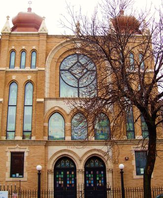 Located at 115 Park Avenue, this Jewish house of worship features green domes and incorporates Gothic Revival and Romanesque Revival architectural elements.