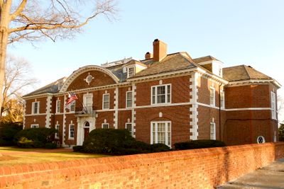 The Georgian Revival clubhouse features a formal dining room, library, and hallways decorated with oak panels and historical photographs.