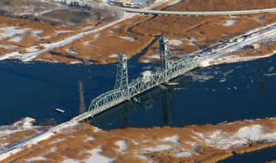 The Upper Hack Lift spans across the Hackensack River with a vertical lifting mechanism that allows passage for both trains and maritime vessels.