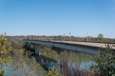 The Veterans Memorial Bridge spans across the Tennessee River with its steel arch design, connecting downtown Chattanooga with the North Shore district.