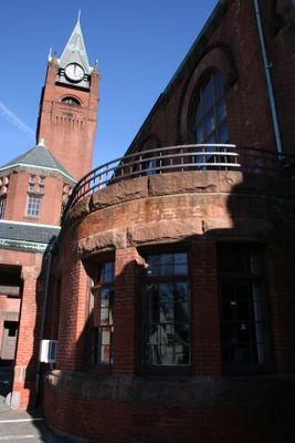 The Ware Town Hall features red brick construction with sandstone trim, incorporating a tall hip roof and a prominent tower on one side.