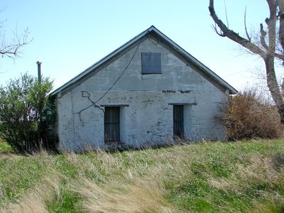 Located nine miles north of Big Springs on Day Road, the house maintains its original structure and includes a kitchen with a hand pump and modern stove.