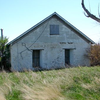 The Wallace W. Waterman Sod House features thick walls made from grass and soil blocks, with deeply set windows and concrete exterior covering.