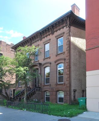 The five-bay townhouse features a brownstone facade, segmental-arched windows, and an elaborate cornice at the roofline on Washington Avenue between Lark and Dove streets.