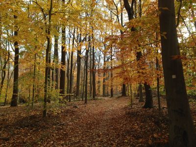 The 2000-acre Watchung Reservation extends between ridges of First and Second Watchung Mountains, containing valleys, forests, and numerous hiking trails.