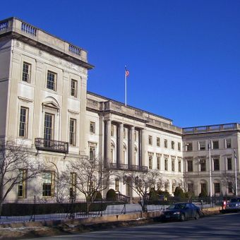 The buildings feature carved quotations from Abraham Lincoln and incorporate Vermont marble walls, stained glass windows, and ornate wooden architectural details.