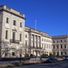 Inside City Hall, the central staircase illuminates a coffered ceiling through stained glass windows, while eagle brackets support the marble wall paneling.