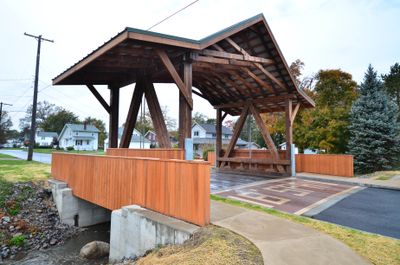 The West Liberty Covered Bridge extends 18 feet over Cowles Creek, featuring wooden construction and footpaths on both sides for pedestrian access.