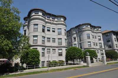 The building incorporates bowed window bays at each corner and includes balconies on some side-facing units, demonstrating early concrete architectural innovation.