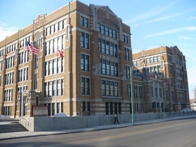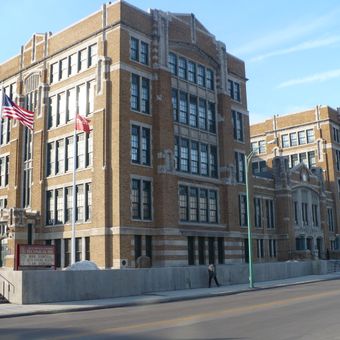 Hutchinson Central Technical High School stands among the residential structures, adding educational architecture to this preserved nineteenth-century neighborhood.