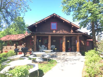 The Wilford H. Fawcett House sits on a point overlooking Big Pelican Lake, featuring a Y-shaped layout and Norwegian pine log construction throughout its structure.